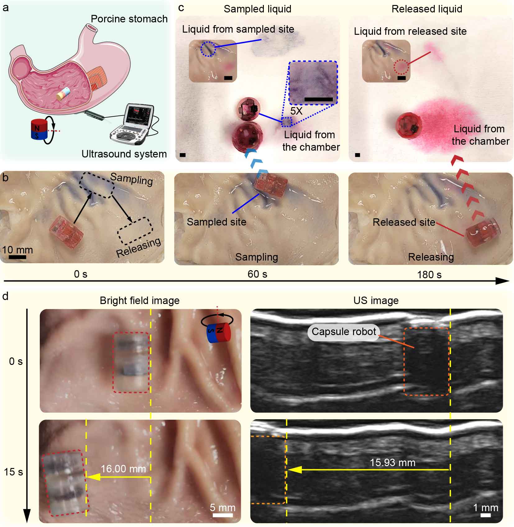 离体猪胃实验。(a)实验装置示意图。(b)胶囊机器人依次在不同部位执行活检和药物释放。(c)腔道内和执行位置的液体对比。比例尺为 2 毫米。(d)通过滚动运动在猪胃中进行导航的明场图像和超声图像。