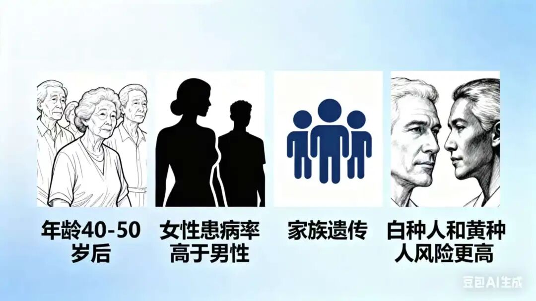 ②性别:女性患病率远高于男性。特别是绝经后的女性,由于雌激素水平骤降,会经历一个骨量快速流失的时期。