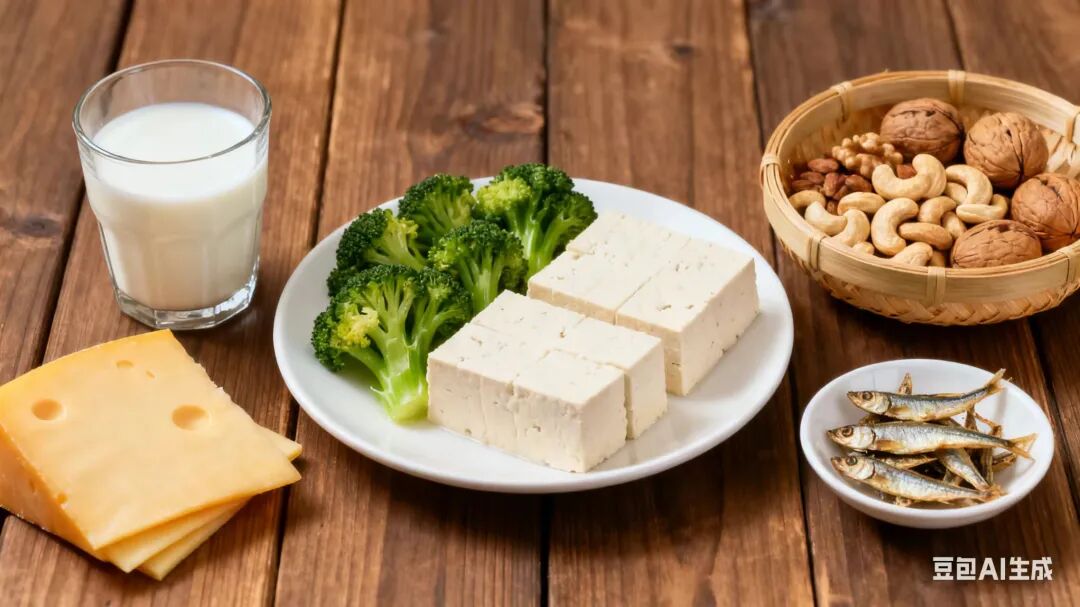 最佳来源:奶制品(牛奶、酸奶、奶酪)、豆制品(卤水/石膏豆腐)、深绿色蔬菜(西兰花、羽衣甘蓝)、坚果、小鱼干等。
