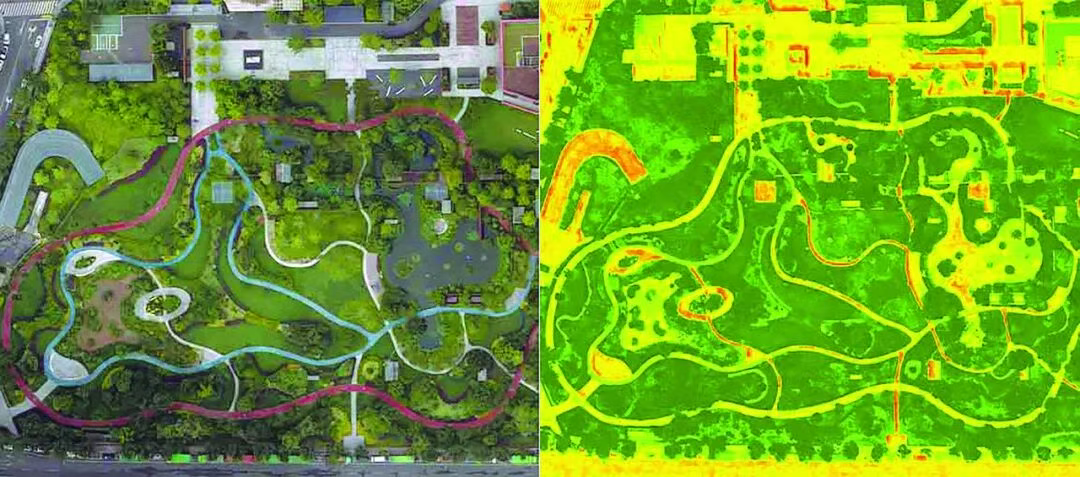 城市公园卫星图(左)和单曝光高光谱相机拍摄的城市公园光谱图(右)