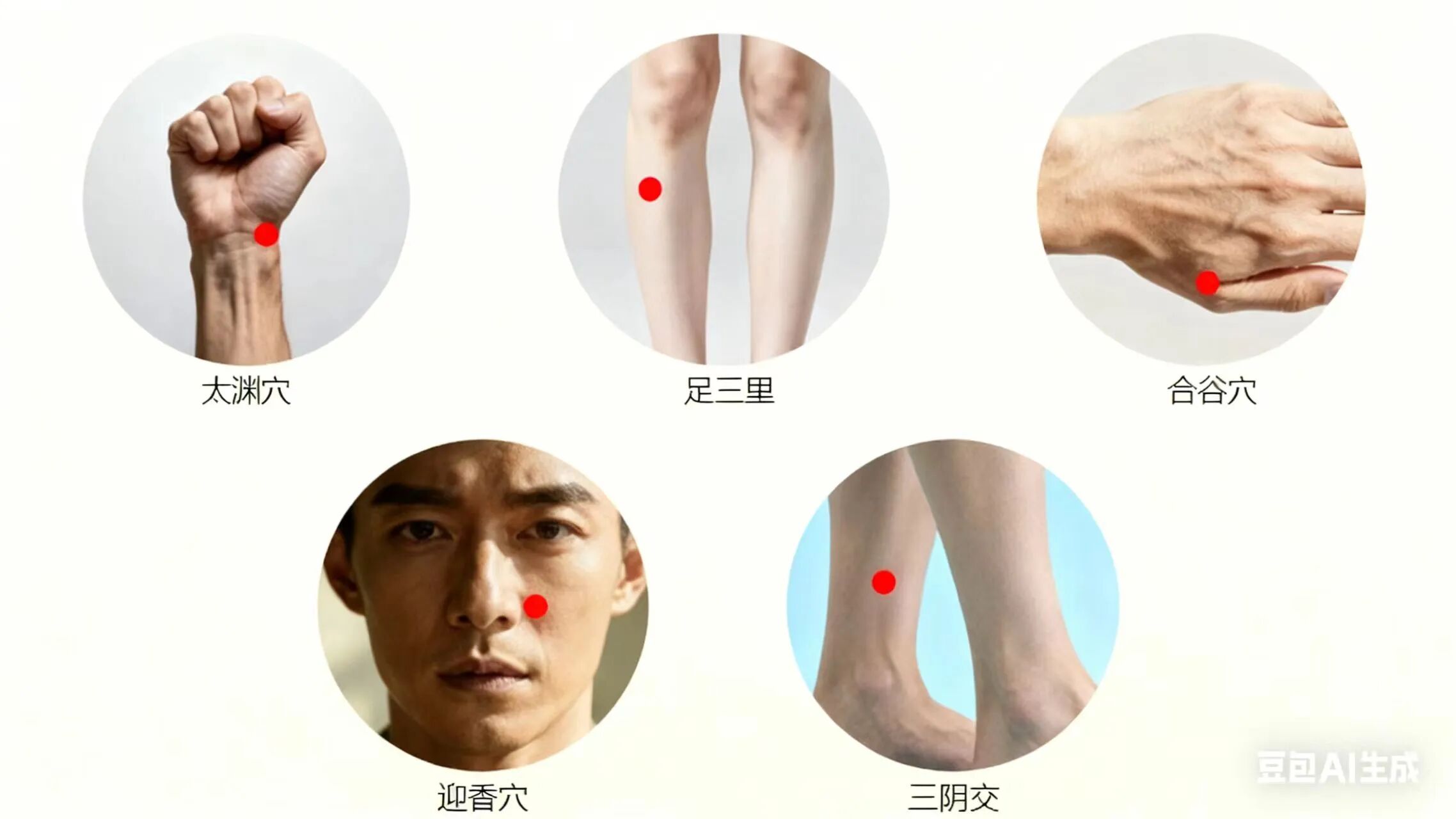 5. 三阴交(内踝尖上4指):滋阴润燥,改善皮肤干燥问题。