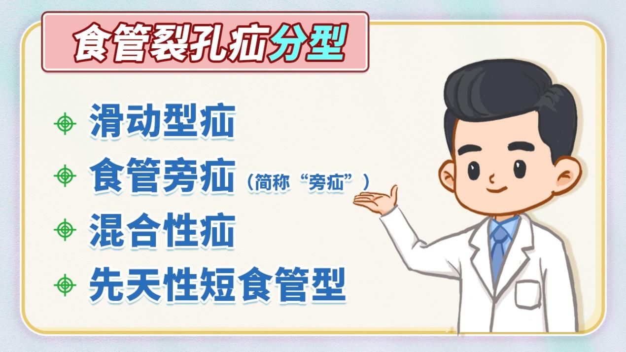 此外,食管裂孔疝还有其他不同的分型方式。例如,有一种分法未将“先天性短食管型”单独列出,而是将“巨大型疝”列为独立类型。实际上,巨大型疝本质上是混合性疝的特殊类型,其区别在于,除胃组织疝入胸腔外,还伴随脾脏、腹膜、结肠等其他腹腔脏器疝入,病情更为严重。