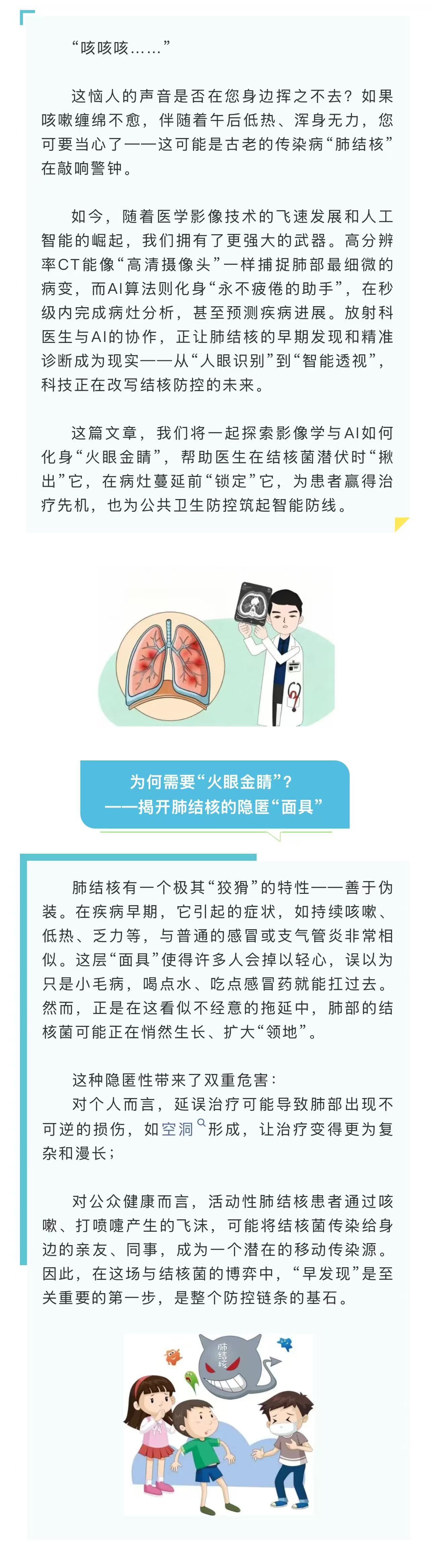 图文简介: 我们将一起探索影像学与AI如何化身“火眼金睛”,帮助医生在结核菌潜伏时“揪出”它,在病灶蔓延前“锁定”它,为患者赢得治疗先机,也为公共卫生防控筑起智能防线。