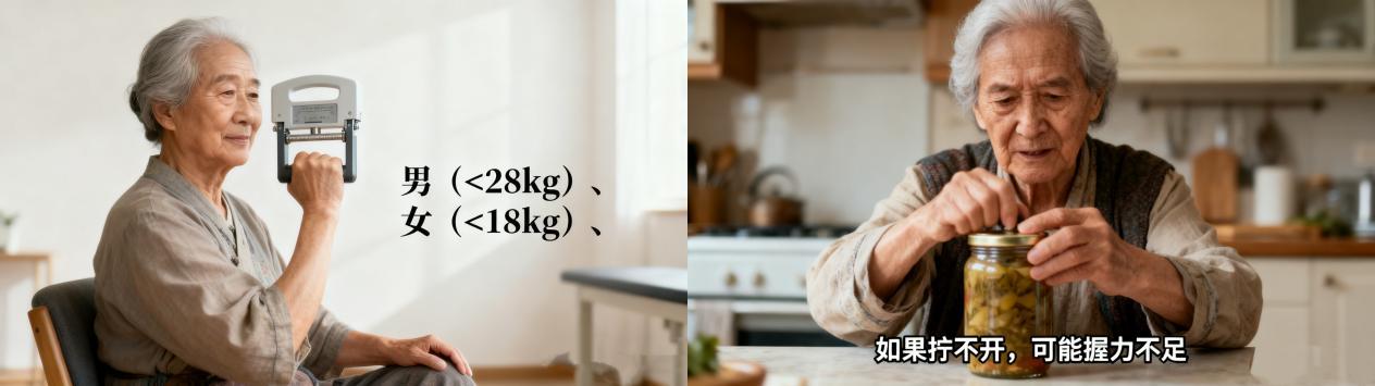 若能借到电子握力计最佳。若无,可观察日常功能性表现,如:能否相对轻松地拧开一个标准的罐头瓶盖?若使出全力仍纹丝不动,而同龄人可以,则您的握力可能偏弱。(专业值:男