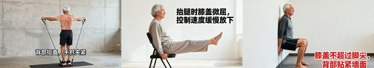 自重训练:坐姿抬腿、靠墙静蹲、举小哑铃/水瓶。