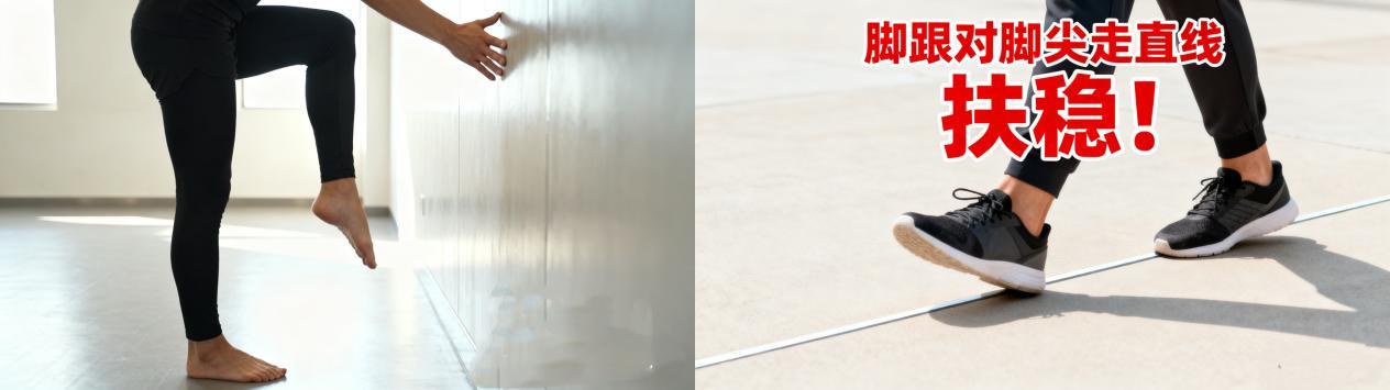 扶墙金鸡独立(手扶稳固的墙壁或椅子,单腿站立,逐渐延长站立时间)、脚跟对脚尖走直线、打太极拳。