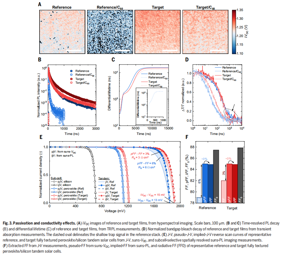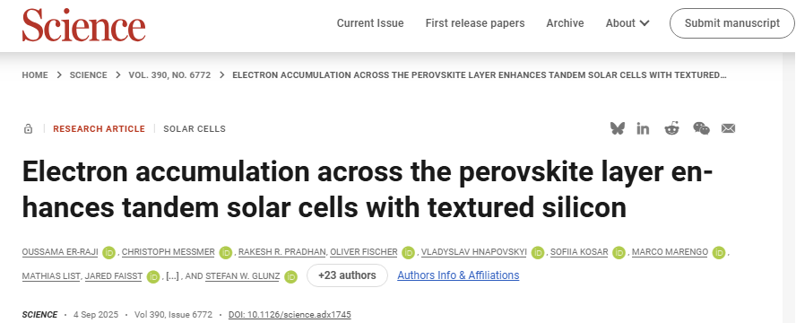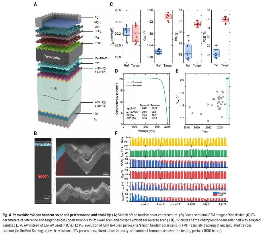 如今,由 Oussama Er-raji 团队主导、发表于《Science》(DOI: 10.1126/science.adx1745)的研究,用一项巧妙的界面工程突破了这一困境。他们通过在钙钛矿表面引入特殊分子,诱导电子在整个钙钛矿层中 “全域积累”,不仅将全纹理叠层电池的效率推至 33.1%(VₒC 达 2.01V),更实现了 1500 小时的户外稳定运行。这项研究不仅刷新了性能纪录,更证明:工业级硅衬底的粗糙纹理,不再是高效钝化的 “死穴”。