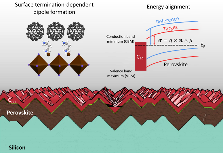 当全球光伏产业朝着 “太瓦级部署” 的目标冲刺时,一个核心矛盾始终凸显:如何在提升电池效率的同时,兼顾成本控制与现有硅产线的兼容性?钙钛矿 / 硅叠层太阳能电池给出了答案 —— 它能突破单结硅电池的效率天花板(~26%),且仅需极低的附加生产成本,目前实验室最高功率转换效率(PCE)已达 34.85%。但真正阻碍其落地的 “拦路虎”,是工业级 “全纹理结构” 的性能瓶颈:采用金字塔高度>1μm 的硅衬底(无需修改现有硅产线)时,钙钛矿与电子传输层(C₆₀)的界面钝化不足,导致光电电压(VₒC)和电荷传输损失显著,效率始终低于 32%。