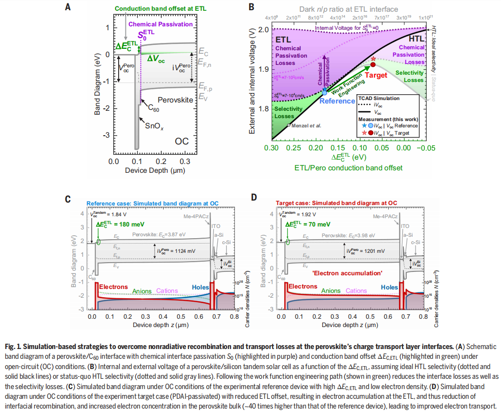 通过光电模拟,团队提出了两种优化路径:一是传统的 “化学钝化”(降低表面复合速度),二是更具创新性的 “功函数工程”—— 通过调制界面电荷载流子浓度,实现 “场效应钝化”。而后者的独特优势,恰恰契合了钙钛矿的本征特性。