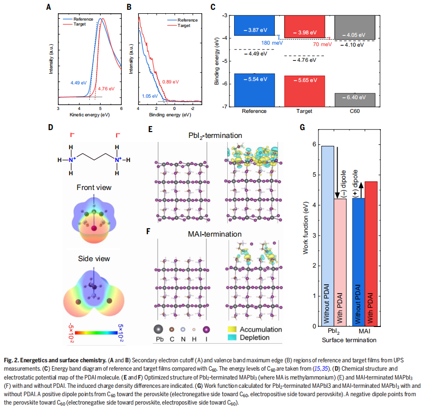 X 射线光电子能谱(XPS)和紫外光电子能谱(UPS)证实,PDAI 与钙钛矿表面的有机组分(因混合沉积法形成 “有机富表面”)发生选择性相互作用,形成了 “从 C₆₀指向钙钛矿” 的正偶极子。这一偶极子直接改变了能级对齐: