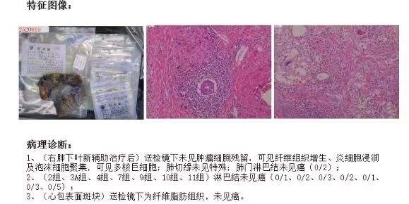 胸外科主任医师蔡利佳介绍,一位患者徐先生(化名)确诊时肿瘤较大且伴有淋巴结转移,属于典型的局部晚期,右肺下叶中央型鳞癌 cT3N1M0 IIIA期,采用“新辅助免疫联合化疗”方案。4周期后复查CT显示肿瘤基本消失,随后为他进行了胸腔镜微创手术,术后病理报告证实,切除的肺组织和淋巴结内均未找到存活癌细胞,达到了pCR。患者恢复良好,目前已回归正常生活。