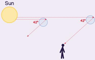当被分解成彩色的光线从水滴射出的时候,并不是朝所有方向乱飞,而是在42度的位置最为集中,注意,这里的42度不是相对于地面或天空测量的,而是相对于反日点方向。所有与这个方向偏离42度的方向上,都有彩色光线进入你的眼睛。