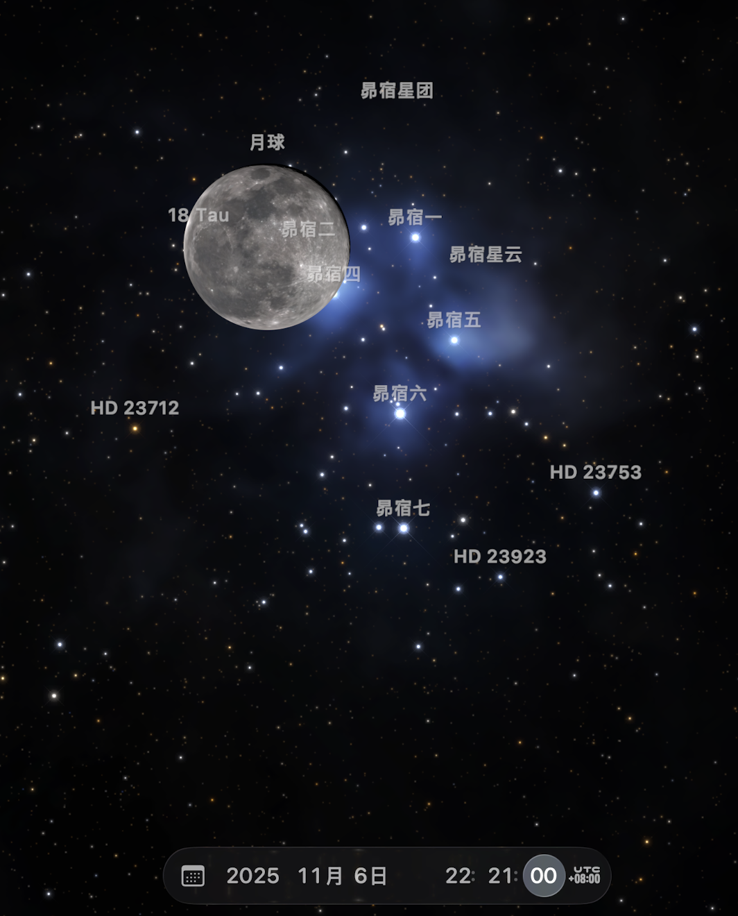 11月6日晚上22时左右月亮开始掩昴星团的北侧,2个小时后离开昴星团。