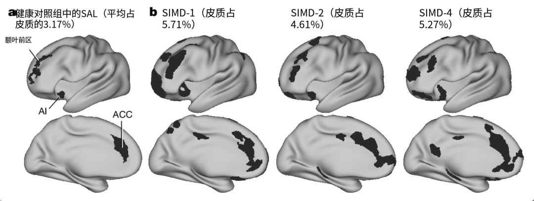 在大量样本的抑郁症患者皮层中,前纹状体显着网络扩大了近两倍。a、显著性网络(黑色)在 LPFC、ACC 和 AI 中有代表性。b 、来自数据集的三个代表性个体的显著性网络丨参考资料 1