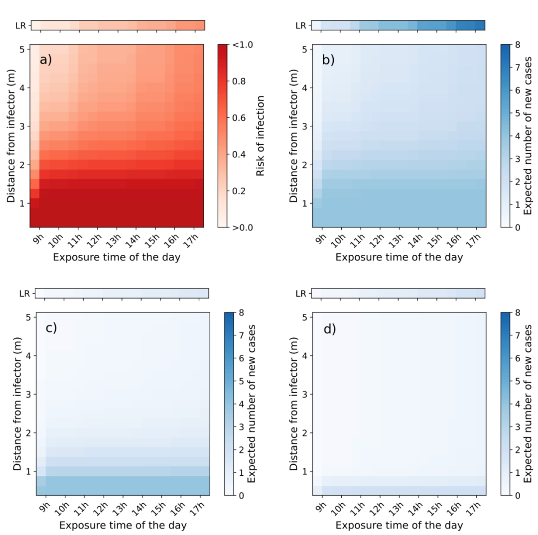参考资料[2]:二次感染风险分布热图,a、b为未干预条件下的风险,c为所有学生佩戴 FFP2 口罩后,d为感染者佩戴外科口罩。