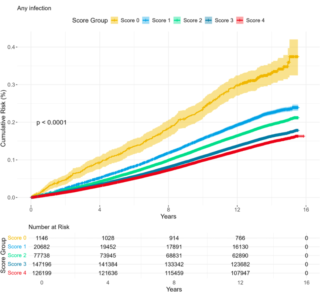 [5]:按健康睡眠评分分层的任何感染的住院累积风险(得分越高睡眠越好)
