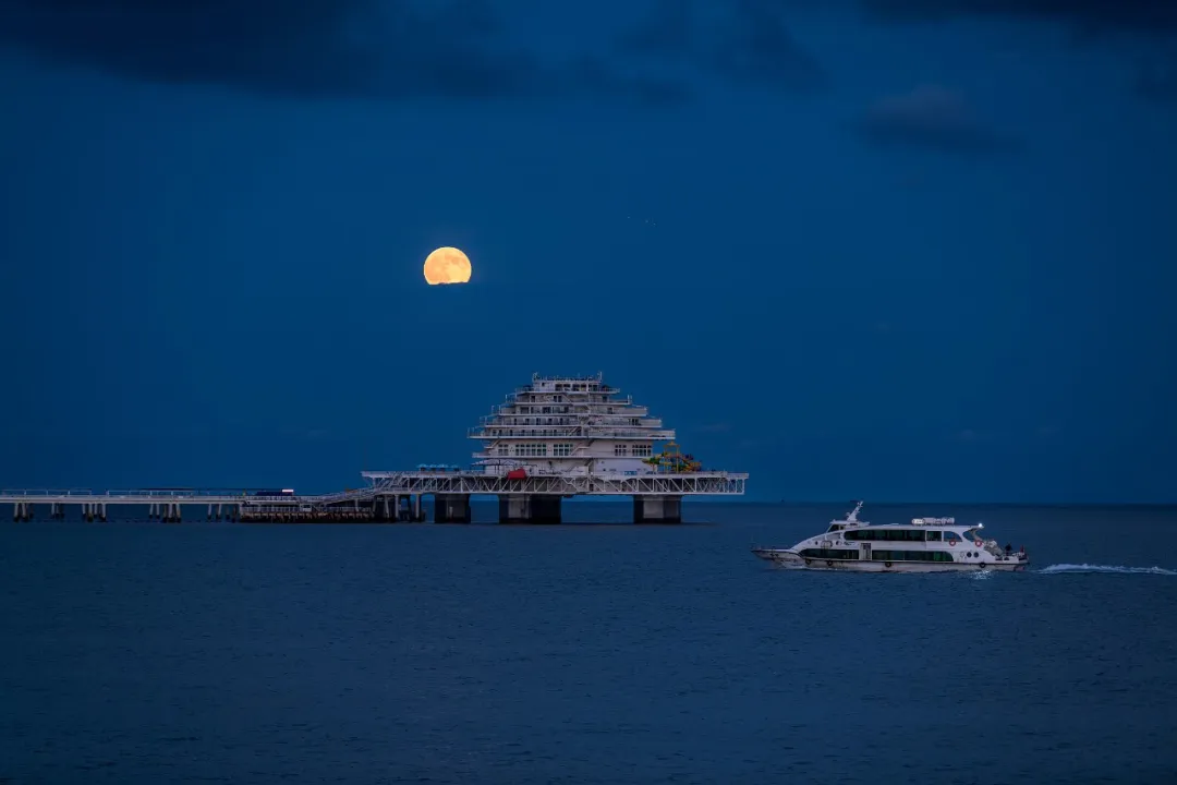 △2025年10月7日,山东烟台渔人码头,“超级月亮”亮相夜空。