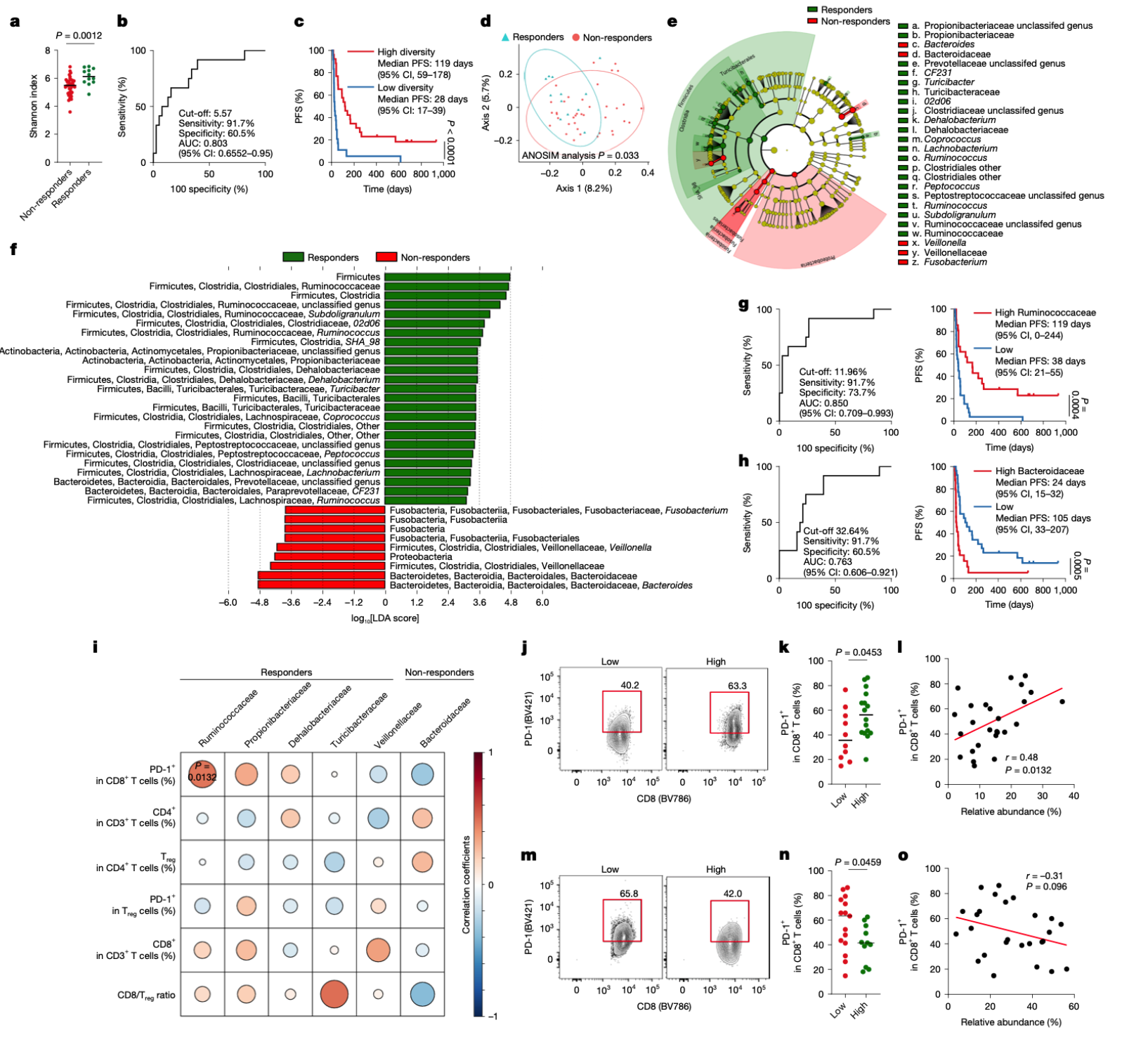 图1 | 接受PD-1免疫治疗的癌症病人,如果他们的肠道细菌种类更丰富、含有更多“瘤胃球菌科”这种有益菌,治疗往往效果更好。这可能是因为这些有益菌能帮助身体激活更多攻击肿瘤的免疫细胞(PD-1阳性的CD8+ T细胞)让免疫疗法更有威力。