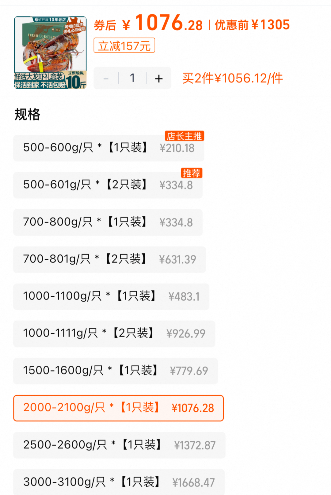 走出餐厅,就算是在网购途径,波士顿龙虾的售价也居高不下。比如网上随手搜的这家店,2000g 的波士顿龙虾售价是 1305 元,换算单价看着也没有贵到离谱?