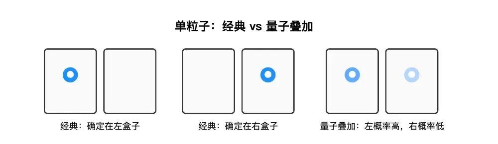 举一个简单的例子:设想有两个小盒子,粒子只能出现在其中一个盒子里。按照经典的直觉,它要么在左边的盒子里,要么在右边的盒子里,永远不会同时在两个地方。但在量子实验中发现,在没有测量之前,粒子并不是已经待在左边或者右边,而是处在一种同时“包含左和右可能性”的状态。