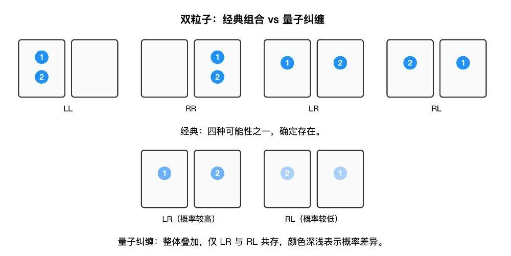 但在量子物理中,如果两个粒子的位置发生了“两个粒子所在的盒子必须不同”的纠缠,那么情况就完全不同。在测量之前,它们并不是已经固定在某一种组合,而是处在一种整体性的叠加状态。在这种状态下,只允许两种可能性同时存在: