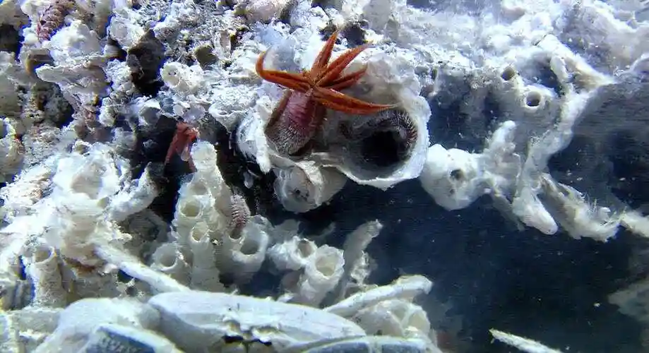 庞贝虫(Alvinella pompejana)把巢穴贴在烟囱壁上,穿梭于几十摄氏度的温差梯度,背部共生菌与分泌物有助隔热、解毒,被视为最耐高温的多细胞动物之一(可短时承受高于40°C)。