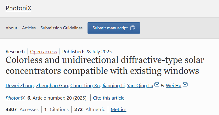 [1] Zhang, Dewei, et al. "Colorless and unidirectional diffractive-type solar concentrators compatible with existing windows." PhotoniX 6.1 (2025): 20.