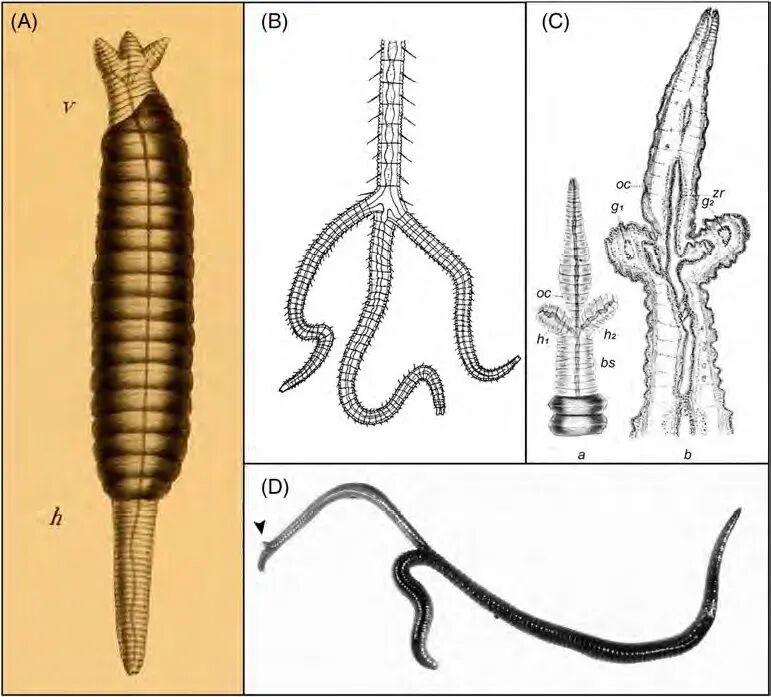有三个叉的环节动物,A,三个头的普通蚯蚓;B,三个身体末端的正颤蚓;C,学名Criodrilus lacuum的蚯蚓,有两个头和一个身体末端;D,尤金真蚓,身体后段分叉,可见其中一个末端又出现一个小分叉;图源:参考文献 [1]