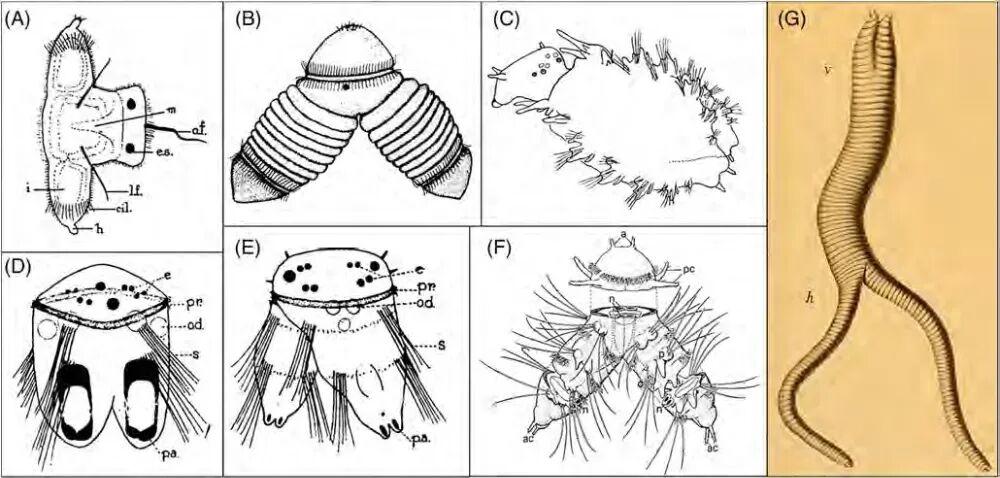 环节动物的畸形胚胎,A 至 F 是各种环节动物的雅努斯(Janus)胚胎,分别来自毛翼虫属(Chaetopterus)、小头虫(Capitella capitata)、褐片阔沙蚕(Platynereis dumerilii)、琥珀刺沙蚕(Alitta succinea)、杜氏阔沙蚕(Platynereis dumerilii);G是双胸蚓属的(Bimastos rubidus)十字联体畸胎,身体中间相连,但有两个头和两个末端;图源:参考文献 [1]