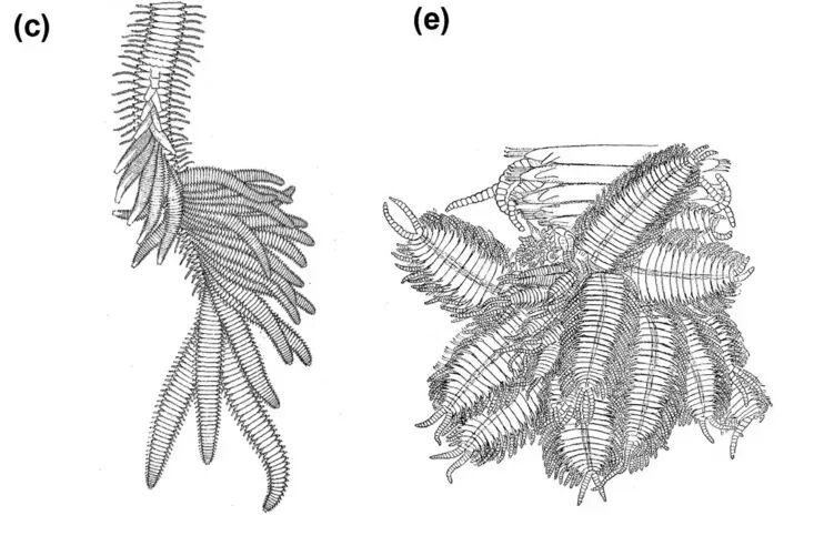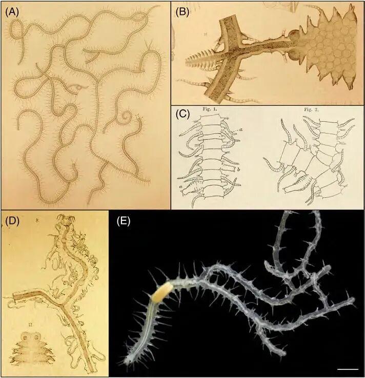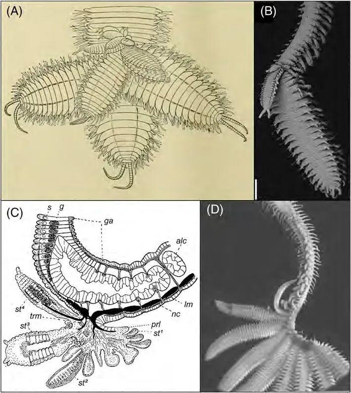 19 世纪 70 年代,英国军舰挑战者号 Challenger 进行的考察中,发现了一种居住在海绵里的裂虫科沙蚕(Syllis ramosa)。最早研究它的科学家之一,麦金托什(William C. McIntosh)发现它有一个正常的头,后面的身体却不断分叉,分叉再分叉,形成一个错综复杂的树枝状结构。每个“树枝”都是结构完整的身体后半段,末端有肛门,内部还有发育完全的肠子。