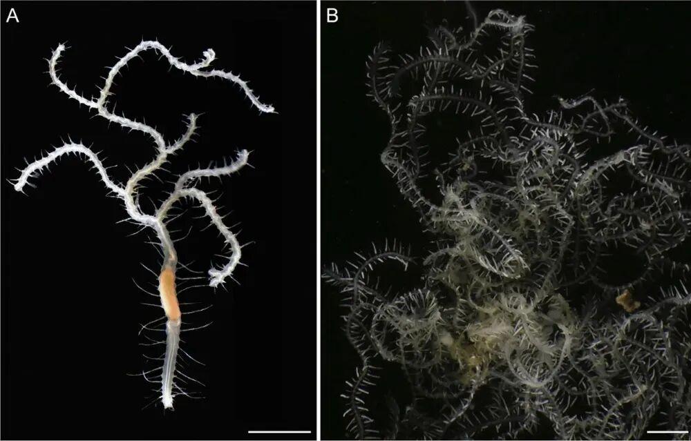 学名 Ramisyllis kingghidorahi 的裂虫科,A,Ramisyllis kingghidorahi 的身体前端;B,身体局部;图片来源:参考文献 [3]