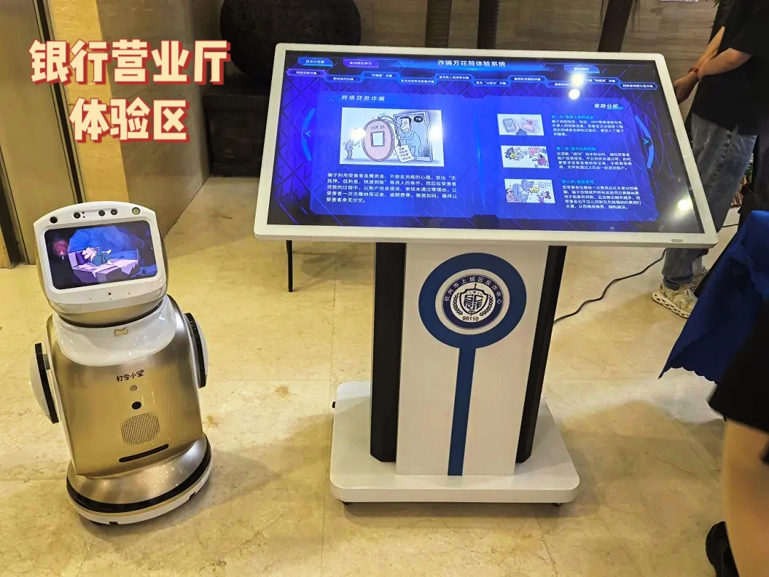 走进银行反诈体验区,小型反诈万花筒、VR一体机、反诈机器人等设备依次陈列,让客户在办理业务间隙即可实时体验:通过反诈万花筒查看拆解的诈骗手段、观看反诈案例,搭配知识测试强化记忆,在趣味互动中记住诈骗套路;戴上VR一体机“亲历”仿冒客服、虚假投资等诈骗场景,直观感受骗局设计逻辑;与反诈机器人对话时,实时识别“转账给陌生账户”“收到安全账户指令”等风险表述,即时推送预警信息与防护建议。这种“边体验、边学习、边防护”的模式,不仅让反诈知识更易接受,更在客户心中筑起主动识别风险的“防火墙”。
