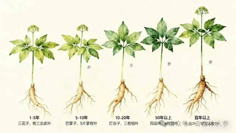 珍贵的老年(50年以上): 能长出4枚复叶(“四品叶”) 的人参,已是参中的长者,至少经历了半个世纪的风雨。而传说中的 “六品叶” ,更是凤毛麟角,非百年光阴不可得,被视为人参中的“王者”。
