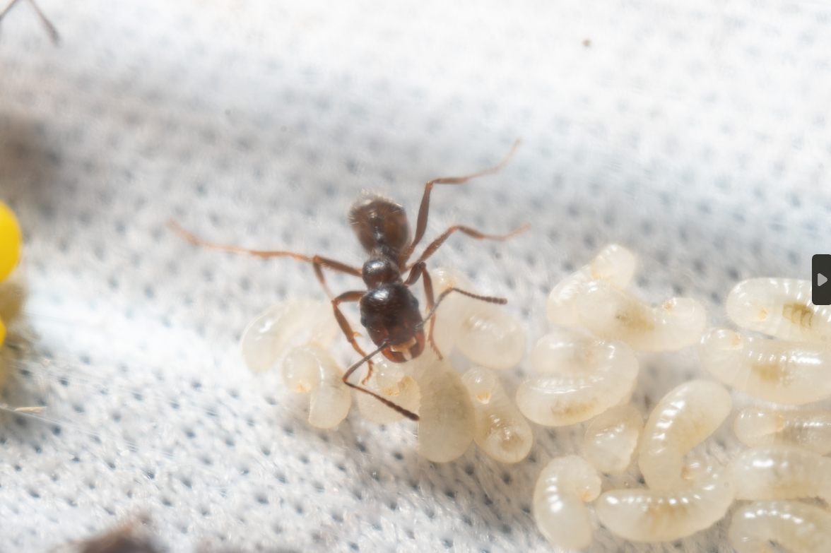 不过再碎的粉末也没法直接食用。工蚁们要将这一团都快成“面团”的东西投喂给幼虫加工一下。幼虫和成年的工蚁很不一样,它们全身圆滚滚,“水桶腰”能正常把食物吞下,还有细碎的牙齿能够进一步咀嚼。幼虫自个享受食物可不行,它们还得将食物消化成液体反刍(其实就是吐出来),喂给工蚁和蚁后,幼虫从“爱吃懒做”的角色身份在收获蚁这直接翻身成了粮食重要的加工厂。