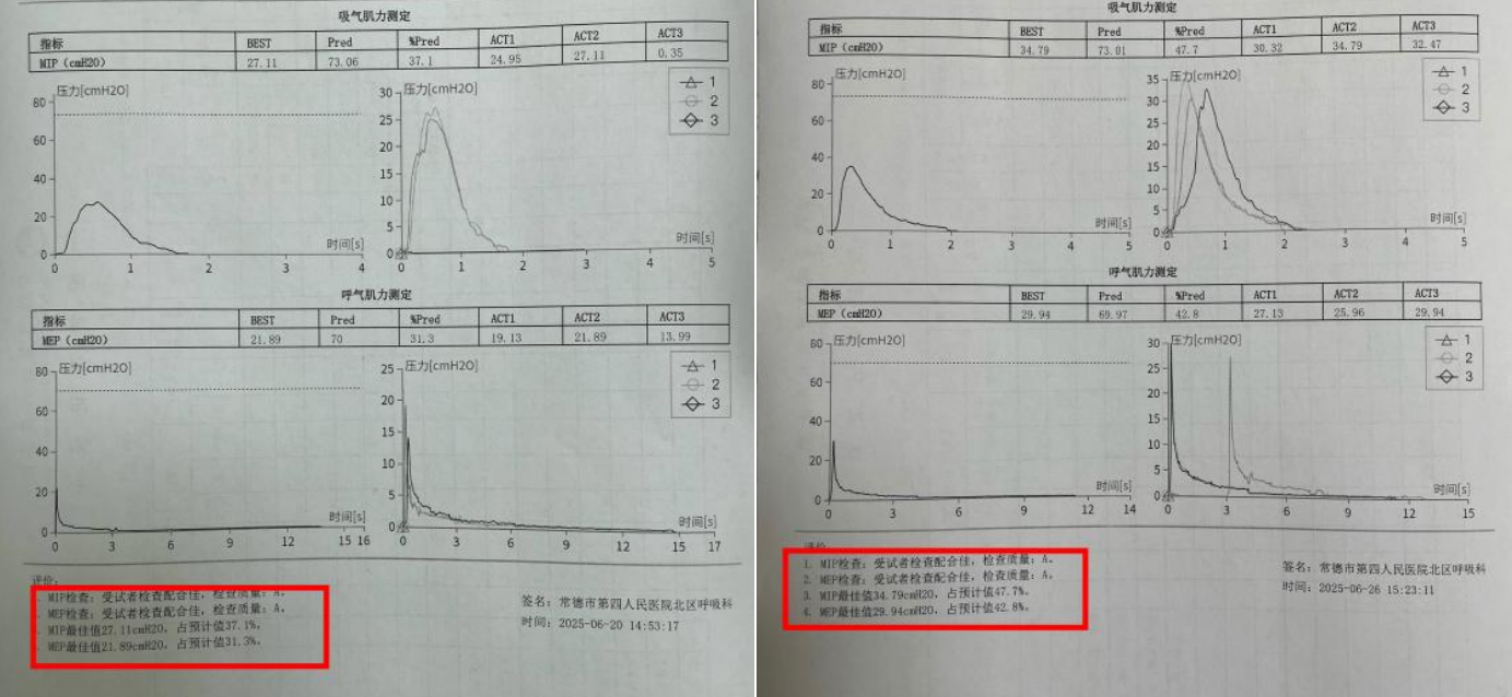 出院前,呼吸康复师再次对贺爷爷进行了呼吸肌力测定,结果显示,他的吸气肌力预计值从37.15%提升到了47.7%,呼气肌力预计值从31.3%提升到了42.8%。