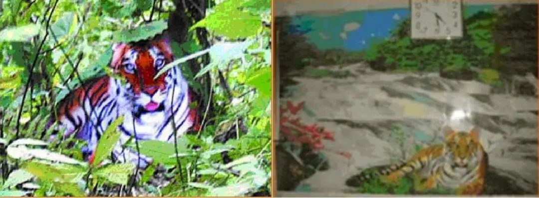 ▲经过技术鉴定,周正龙拍摄的华南虎照片(左)和年画中的老虎(右)是同一只老虎(供图:周琳娜)