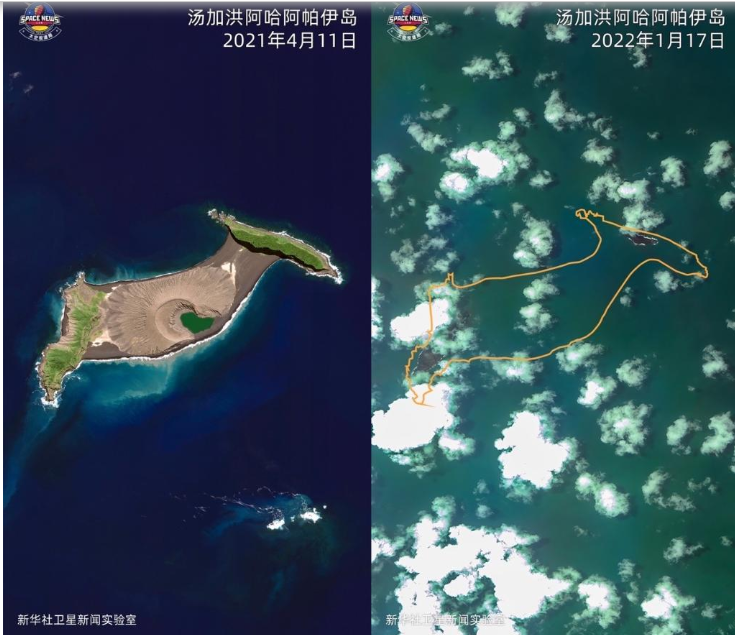 2022年南太平洋岛国汤加火山近日剧烈喷发引发海啸,图为2021年4月11日Worldview02卫星拍摄的汤加洪阿哈阿帕伊岛卫星图片(左)和2022年1月17日“高分一号”卫星拍摄的该岛火山喷发后的卫星图片,橘色曲线为按照地理坐标标注出的岛屿原先轮廓。(图源:新华社)