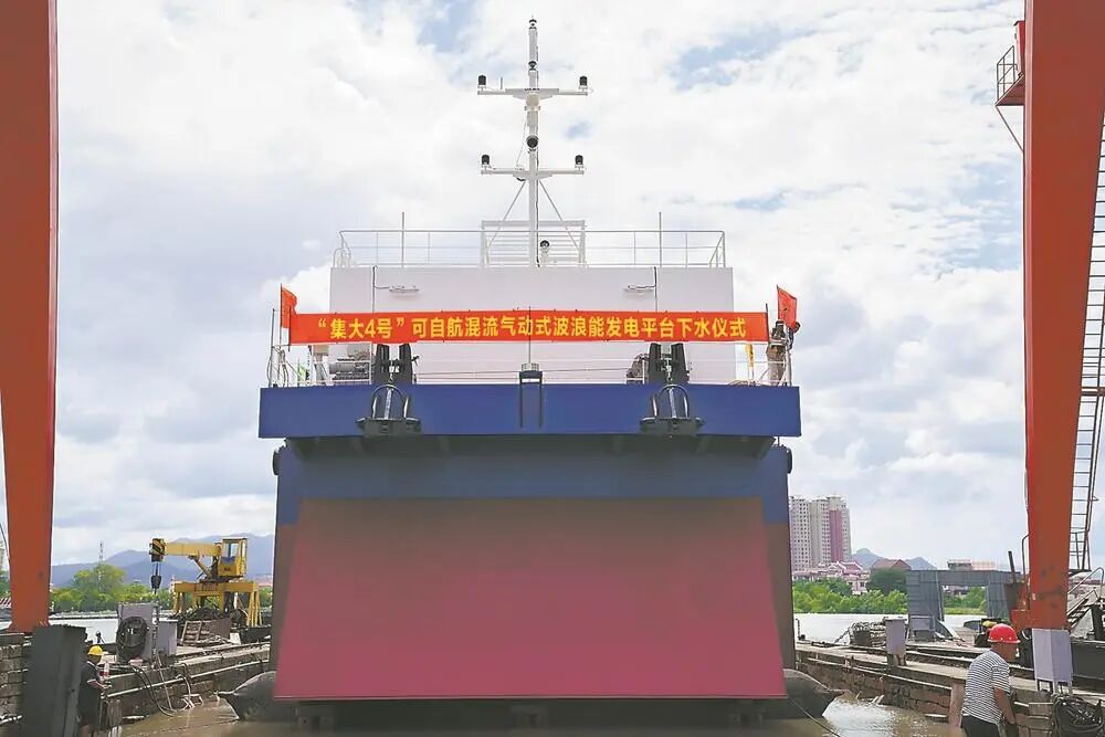 2024年9月。集美大学海洋装备与机械工程学院杨绍辉教授团队的科研项目——“集大4号”可自航混流气动式波浪能发电平台成功下水(图源:新华社)