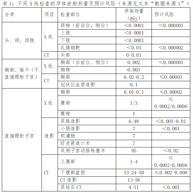 表1中罗列了常见的放射检查的孕体剂量,可以看出,除非直接照射子宫,绝大多数情况下,胚胎的受照射剂量都不超过50mGy。表中乳腺钼靶的胚胎的受照射剂量<0.01mGy,远低于100mGy。