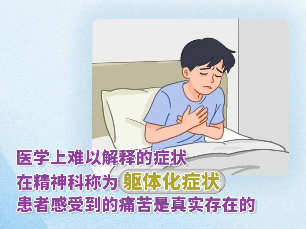 医学上难以解释的症状,在精神科称为躯体化症状,它是真实存在的,那些“不舒服”并不是想象出来的,也不受大脑控制,更不是故意要让自己难受。患者因此非常痛苦,担心自己身体出了大问题,导致反复就医。在这家医院检查说没问题,到那家医院查也说没事,可难受是实实在在存在的,于是就会反复去医院检查,这种行为就像逛商店一样,我们称之为“逛医行为”,他们会找不同的专家看病。而且越关注哪种不舒服,那种不适感可能就会越明显。比如有的人曾经头疼过,那种感觉非常痛苦,于是总在心里想“千万别再犯了,太难受了”。