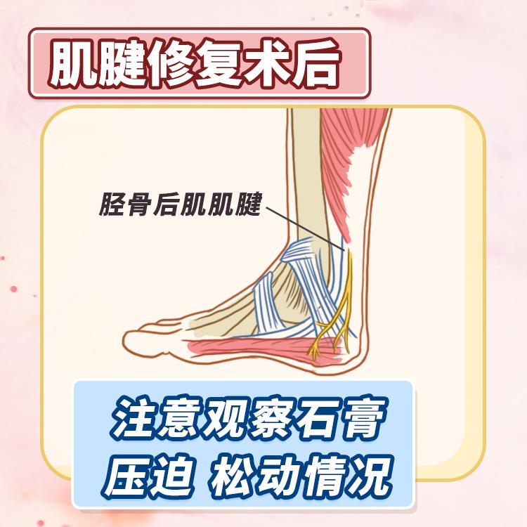 如果患者做的是肌腱手术,术后通常需要进行石膏固定,一般石膏固定的时间是 6-8 周。在此期间,要密切观察石膏是否对脚部造成压迫,因为如果石膏压迫过紧,可能会导致压疮的产生。一旦发现石膏有压迫的迹象,要及时告知医生进行处理。此外,手术后经过一段时间,患者可能会出现肌肉萎缩的情况,或者石膏会出现松动。当出现这些情况时,需要及时找医生对石膏进行适当的调整,以保证石膏的固定效果。