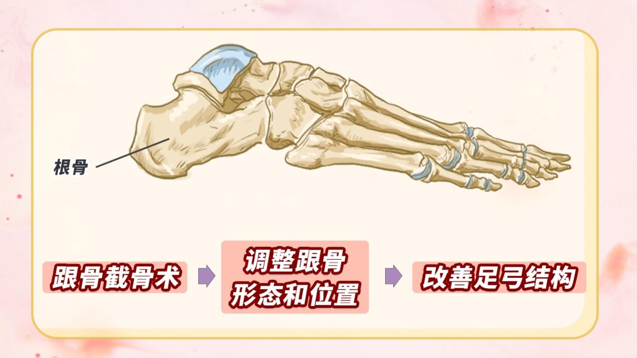 骨的手术主要是通过调整骨骼畸形、纠正骨骼错位、改善骨骼退变,同时恢复足弓正常解剖结构与足部力线传导,从而改善平足症状,具体有以下几种类型: