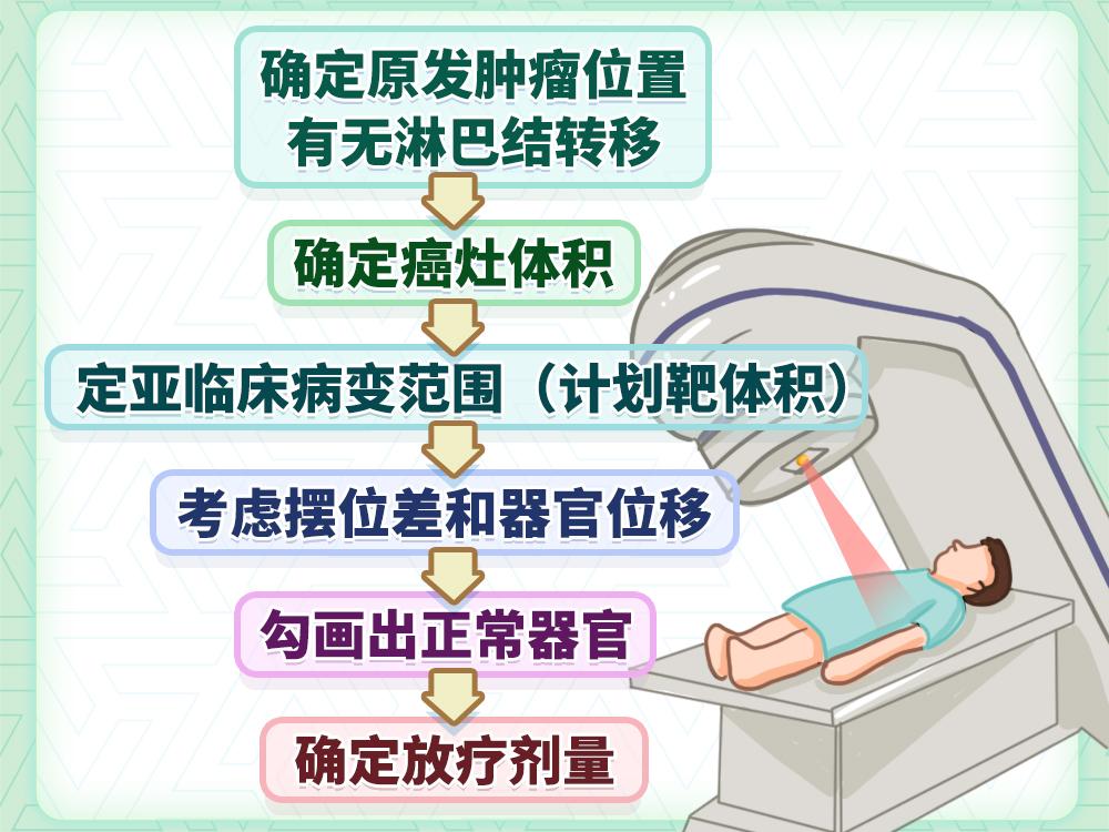 第三步,确定计划靶体积。在上述基础上,综合考虑治疗中的摆位误差和器官位移,最终设计出计划靶体积。整个过程需逐层、逐步精准界定范围,同时还要在每层的横断面CT上勾画正常器官,如小肠、股骨头、膀胱、结肠等。