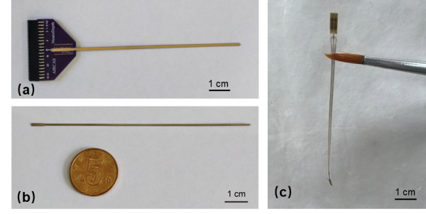 空天院⾃主研发的NeuroDepth临床微电极。(a)32位点临床硬质微电极阵列;(b)13位点临床硬质微电极阵列;(c)16位点双模柔性微电极阵列。