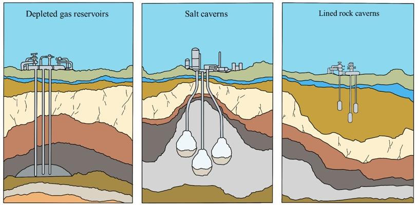 典型的地下储氢技术,从左至右分别是枯竭气藏储气、盐穴储气、衬砌岩洞储气