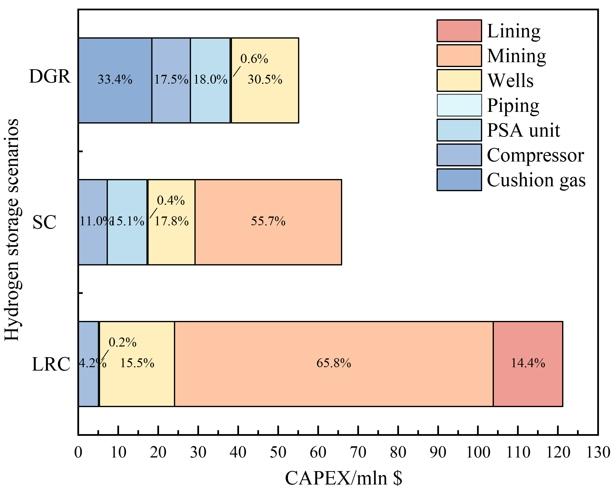 各储氢场景下资本支出成本(CAPEX)组成,其中DGR(depleted gas reservoir)为枯竭气藏;SC(salt cavern)为盐穴;LRC(Lined rock cavern)为衬砌硐室