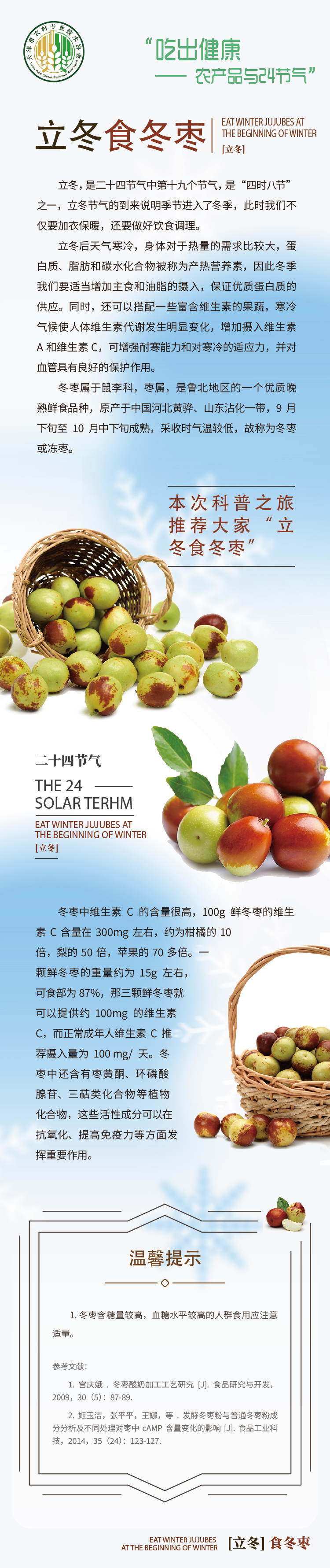 图文简介: 立冬,是二十四节气中第十九个节气,是“四时八节”之一,立冬节气的到来说明季节进入了冬季,此时我们不仅要加衣保暖,还要做好饮食调理,本次科普之旅推荐大家“立冬食冬枣”。