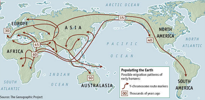 大概6-7万年前,当夏娃的后代在非洲开始玩腻了后,就开始了全球扩张。