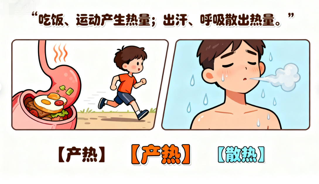 爸爸(护士) : “别急!我们先明白,正常体温是靠‘产热’和‘散热’的平衡来维持的。”