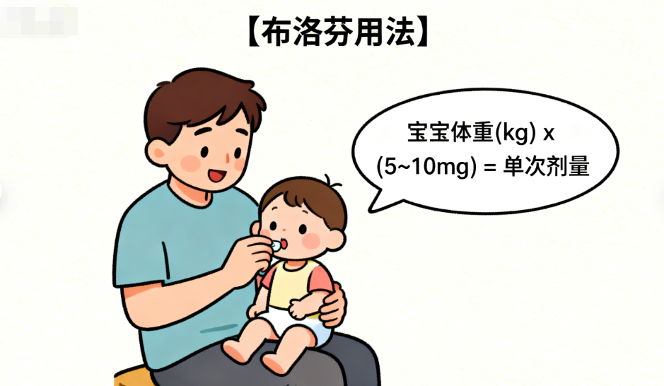 【布洛芬用法】宝宝体重(kg) x (5mg~10mg) = 单次剂量。